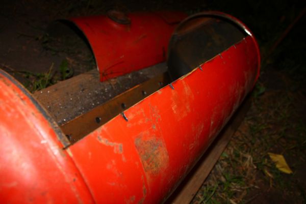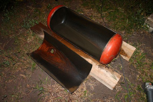 Задний распил решил делать с 50 мм отступом от шва для того, чтобы просверлить отверстия для шампуров. Получилось, что распил я совершил не ровно пополам, а чуть меньше половины баллона.