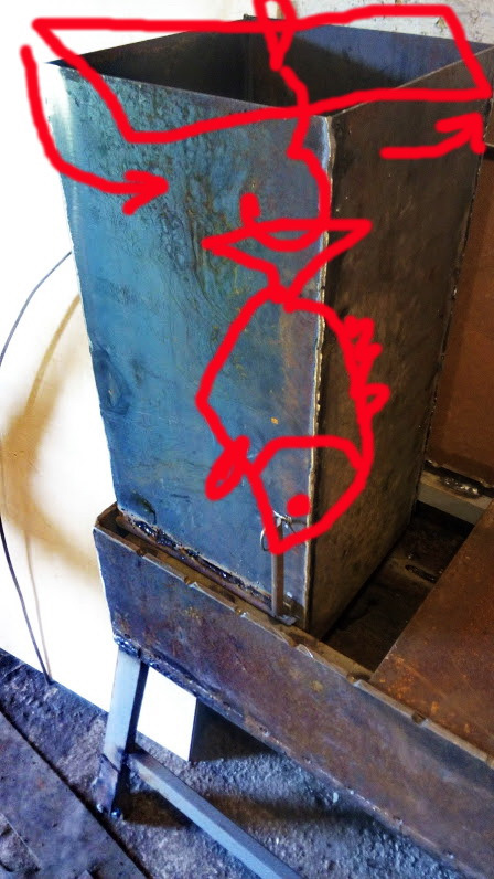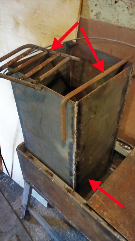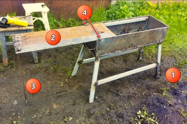 Железо в наличии было либо 6мм, либо 2мм. Ну и соответственно, корпус из шестерки, крышка (2) из двойки. Вес получался большой. И поэтому было решено делать варные ноги из старой теплицы. Причем для удобства поставил колеса (1). Подпорка (3) из прутка десятки. Так же небольшие фиксаторы (4), чтоб крышка не слетала.
