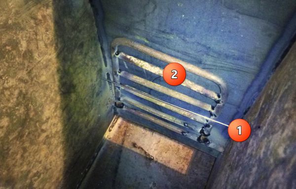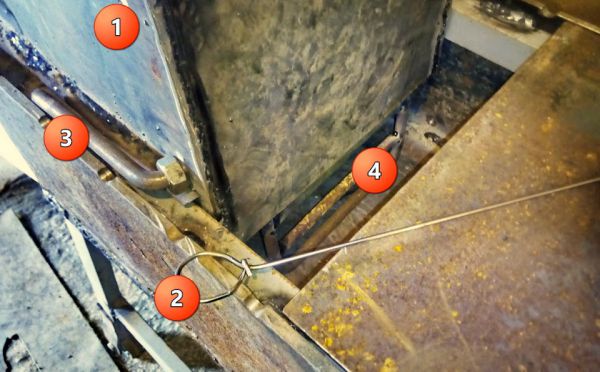 Отверстие (1) под чеку (2), которая фиксирует рычаг (3) решетки (4). По бокам короба приварил полозья (просто пруток)