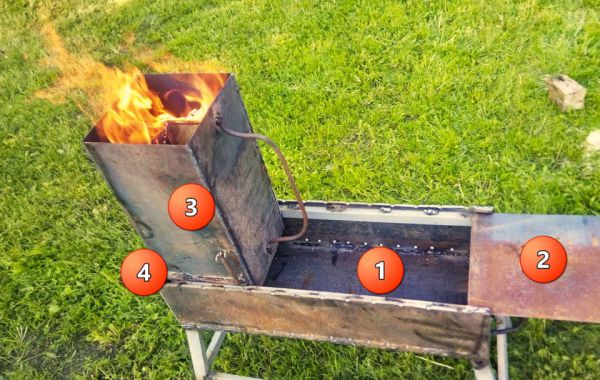 И так: 1) Сам мангал. 2) Сдвижная крышка — столик. 3) Стартер для угля. 4) Коптильня для мяса и рыбы (хотя можно и овощи)