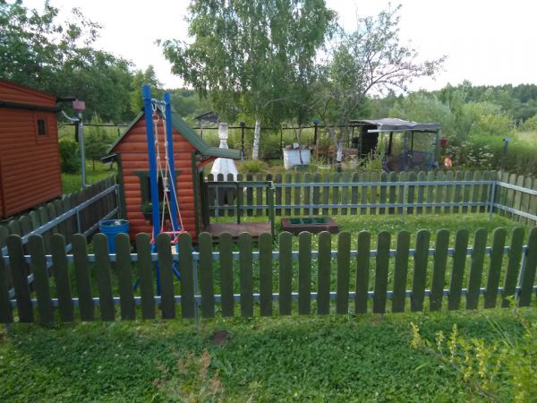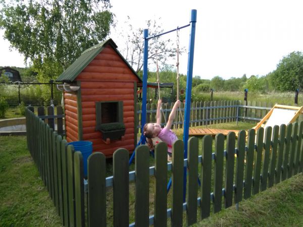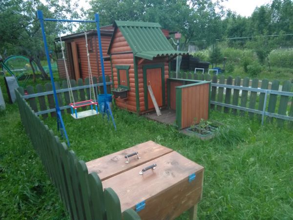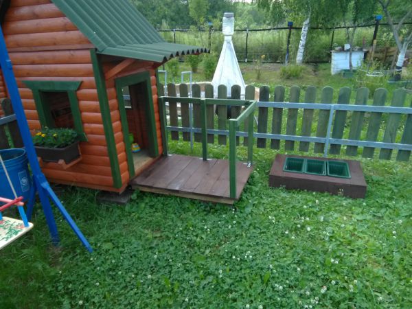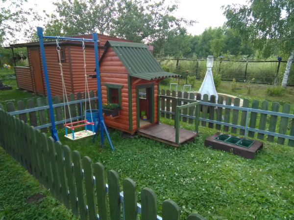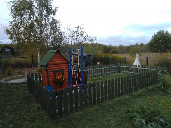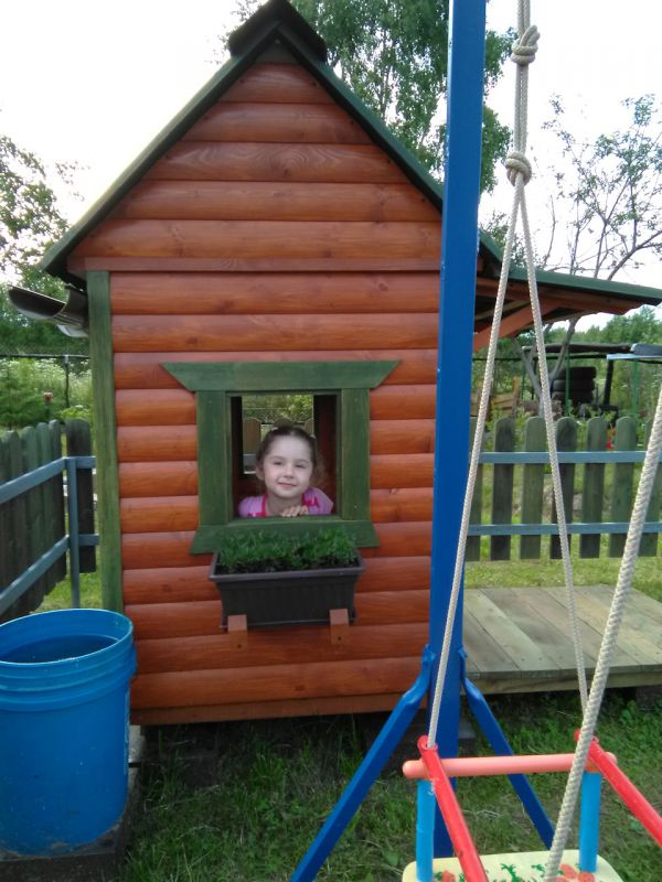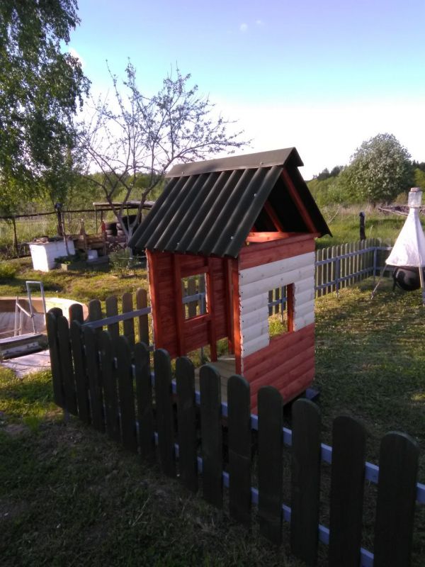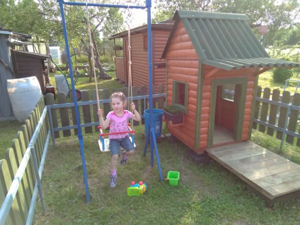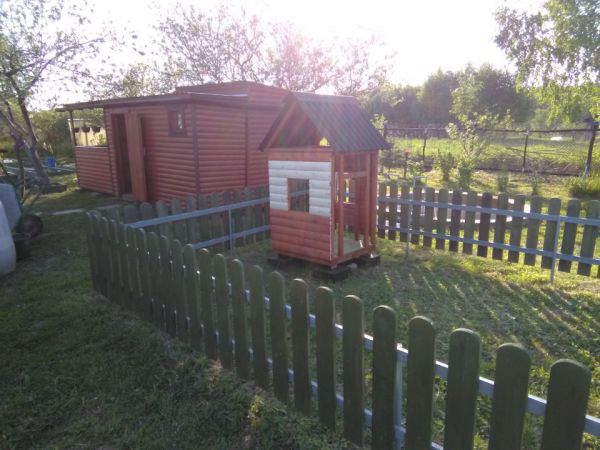 Осталось немного блокхауса после постройки бани, решил смастерить детский домик . Из досок сделал заборчик, огородил площадку, весь огород иногда лень косить, а небольшой участок где играет ребёнок можно почаще, залил 4 блока под домик, собрал каркас, делал всё на ходу, ничего не проектировал, вышло как вышло, после дополнил песочницей, небольшой детской грядкой и качелью и крыльцом с лавкой . Домик не большой, чуть больше кв .метра . Ну пока хватит )) . Каждый раз проверяю его на наличие ос, а то полюбилось им строить свои коконы под крышей. Делал всё плотно, но ставни рассыхаются, щёлку находят.
