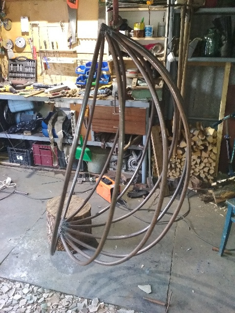 Первый ряд труб в общем составил 2,40,для простоты я резал на 1.70 и гнул в трубогибе, после сваривал.внизу если увидите под ноги загибал так чтобы было удобнее как на табуретке сидеть