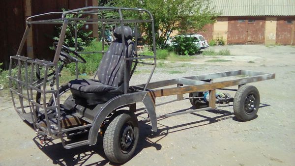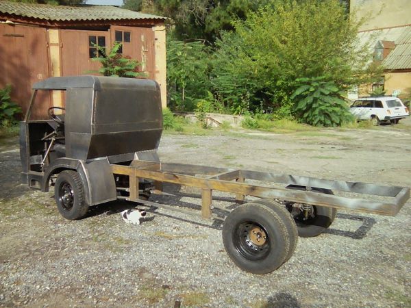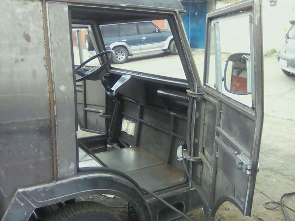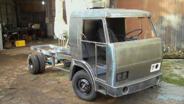 Рама авто сварная — это профильная труба 100 мм на 50 мм. Каркас кабины — также труба 20 мм на 20 мм, обшит листовым металлом.