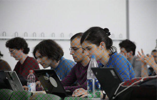 Перед вами черно-белая фотография, на которую, поверх основного изображения, нанесены цветные линии, но наши глаза видят цветную одежду, цветные спинки стульев, и так далее. Если внимательно посмотреть на какую-то небольшую часть изображения, можно заметить серый фон и цветные линии. Но, как уже было сказано, все, что находится за пределами поля зрения фовеа, полностью размыто, поэтому наш мозг смешивает все воедино. Крошечный размер центральной ямки является причиной множества классических оптических иллюзий.
