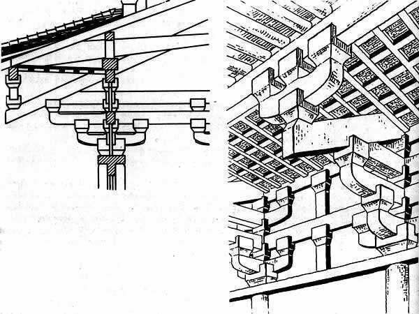 Для поддержания столь сложной крыши китайские архитекторы изобрели совершенно уникальную, нигде более не встречающуюся систему крепления кровли. Здесь нет традиционной для многих архитектурных стилей системы стропил, вместо нее применяется весьма сложная стоечно-балочная конструкция с многоярусными кронштейнами под названием «доу гун».