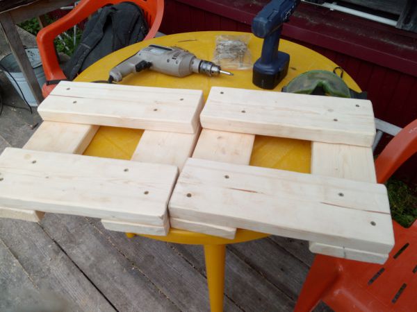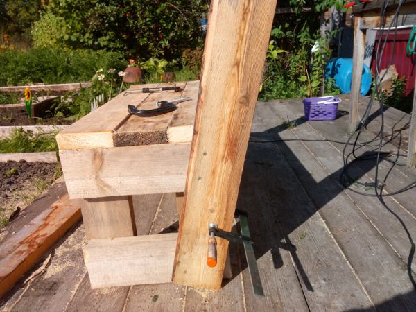После этого с торцов к ножкам креплю отрезки по 0,8 м для основы спинки под произвольным углом, используя струбцины для фиксации, пока держу дрель. Тут желательно, чтобы оси наклона отрезков оказались в одной плоскости. Выверка производилась прецезионным глазом.