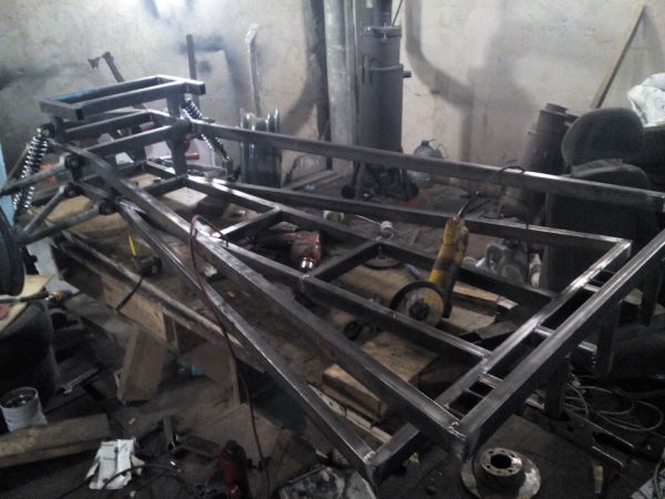 Сварен дугой из профильной трубы 40 на 25 ,40 на 20,25 на 25,полоса 4 на 40.Дорожный просвет спереди 35 см, сзади 28 см(нижняя часть картера мкпп)Ширина-1280 мм межосевое точно замерить не получилось(то времени нет, то помочь некому).