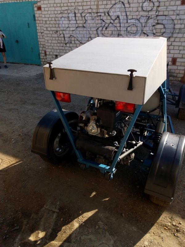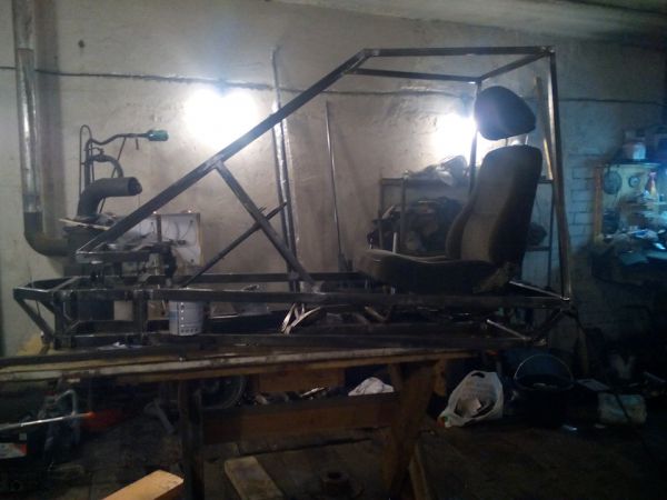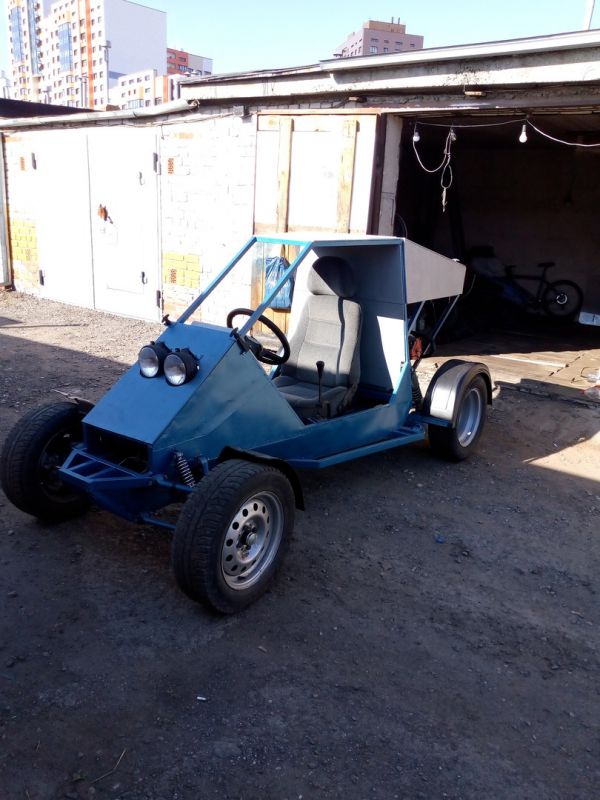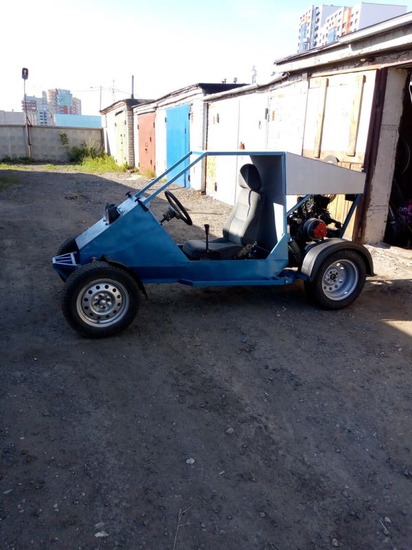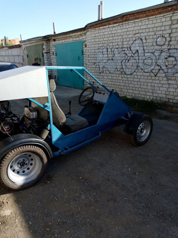 Одноместный багги с полностью независимой подвеской, мотором лифан 190fd (420 см .куб 15 л.с), МКПП ВАЗ-2108 (диф. заварен наглухо)и вариатором "сафари" между ними.Двигатель имеет заводской эл.стартер, установлен генератор 55А от ваз 2105,вакуумный бензонасос от снегохода Рысь.Также была сделана новая система выхлопа с гофрой, полноценным резонатором и глушителем от автомобиля ЗАЗ.Стоит полноценный АКБ на 52Ач(хочу лебёдку!)