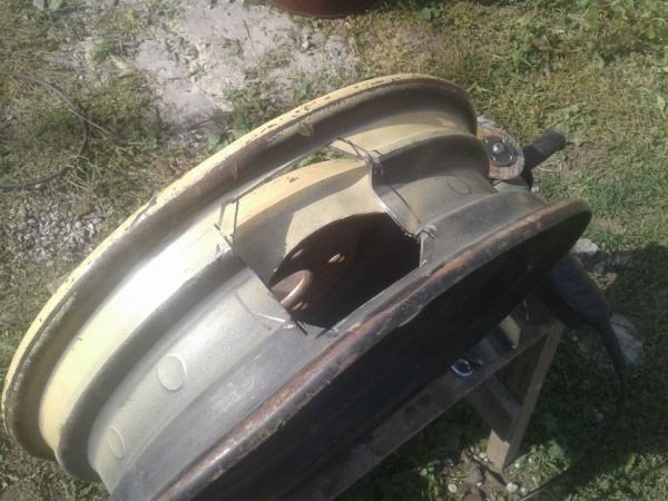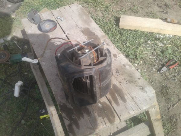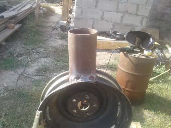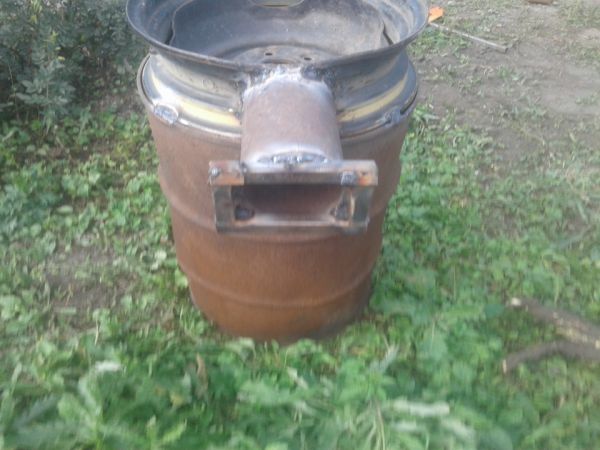 Из профильной трубы изготовил посадку под вентилятор печки ВАЗ 2109. Диск в бочку варил не сплошным швом, четыре прихватки, если бочка прогарит проще будет заменить