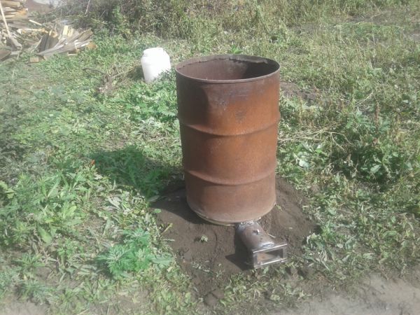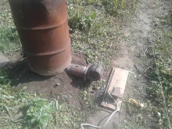Теперь о преимуществах. Первое это скорость сжигания. Так как идет поддув воздуха и температура от этого выше, сырая трава горит так же как и сухая, все сгорает в пепел. И нет ни какого дыма. Единственное, нестоит заполнять печку полную, и делать сильную подачу воздуха. При полной подаче воздуха, и полной бочке травы столб огня поднимается выше метра. Так что кто будет повторять, работайте с ней аккуратно. Сейчас она трудится у меня на участке всё лето. И я ей очень доволен.