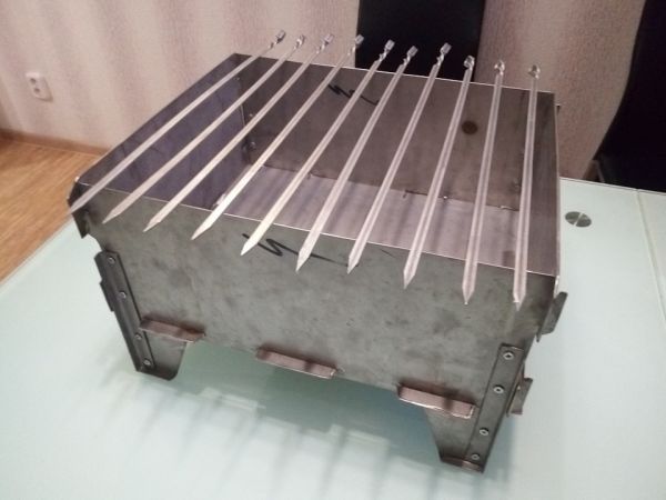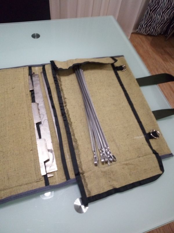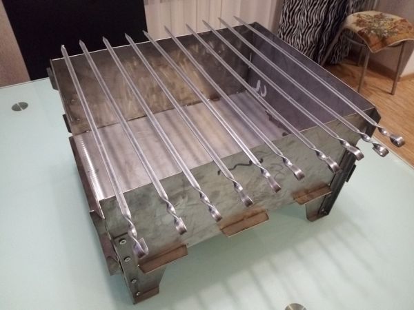 специально для него куплены шампуры. сразу оговорюсь, прорезями под шампур не пользуюсь. Мангал неглубокий, поэтому отверстия для тяги даже не проектировались.