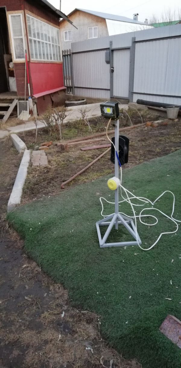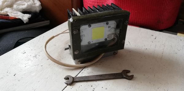 Всем доброго времени суток. Захотелось мне как-то изготовить прожектор для работ по хозяйству, в тёмных углах и в тёмное время суток. Вариантов в интернете масса, но исходил из своих возможностей и пожеланий. Тормозного диска для основания у меня не было и конструкция делалась их имеющихся в наличии кусков проф.трубы 20х20 и 25х25.