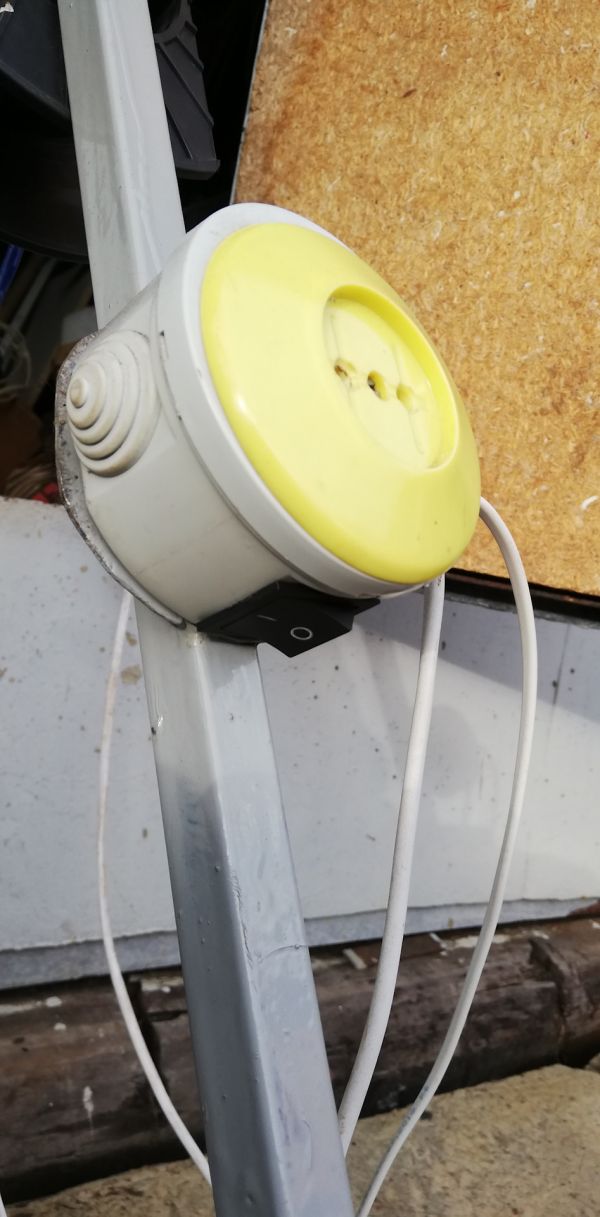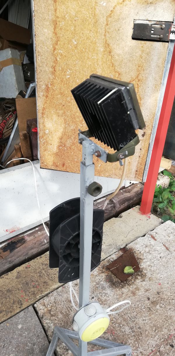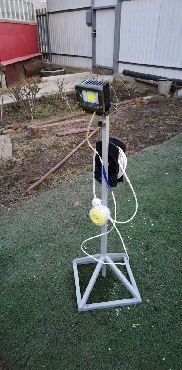 Получилась очень хорошая и устойчивая конструкция. Размер по основанию 30см. В сложенном виде высота около 1 метра, а в выдвинутом примерно 1,8 метра. Катушка для провода сделана из катушки для сварочной проволоки. Розетка советская для внутренней установки, закрепилась маленькими винтами в распределительной коробке, в которую врезан выключатель прожектора, чтобы при необходимости стойку использовать как удлинитель. Кто-то скажет, что внизу слишком много лишнего металла, но он даёт массу, а вместе с ней и устойчивость.