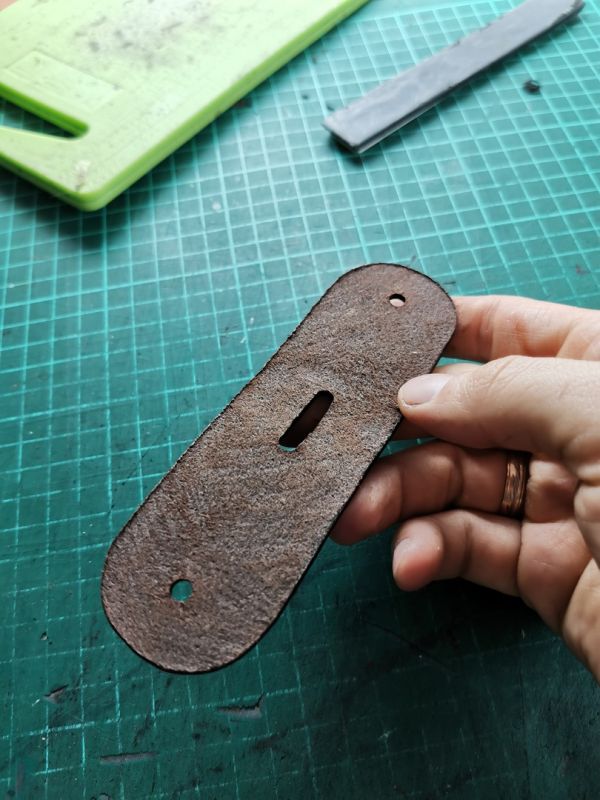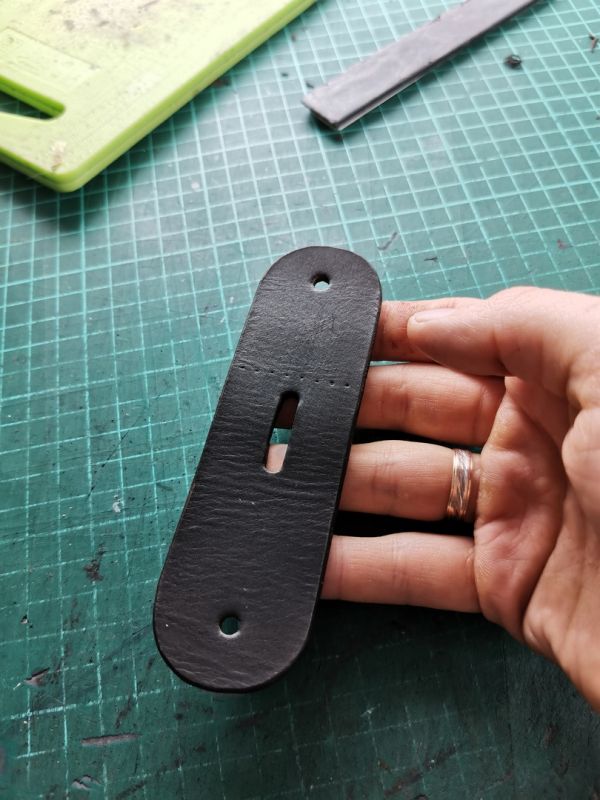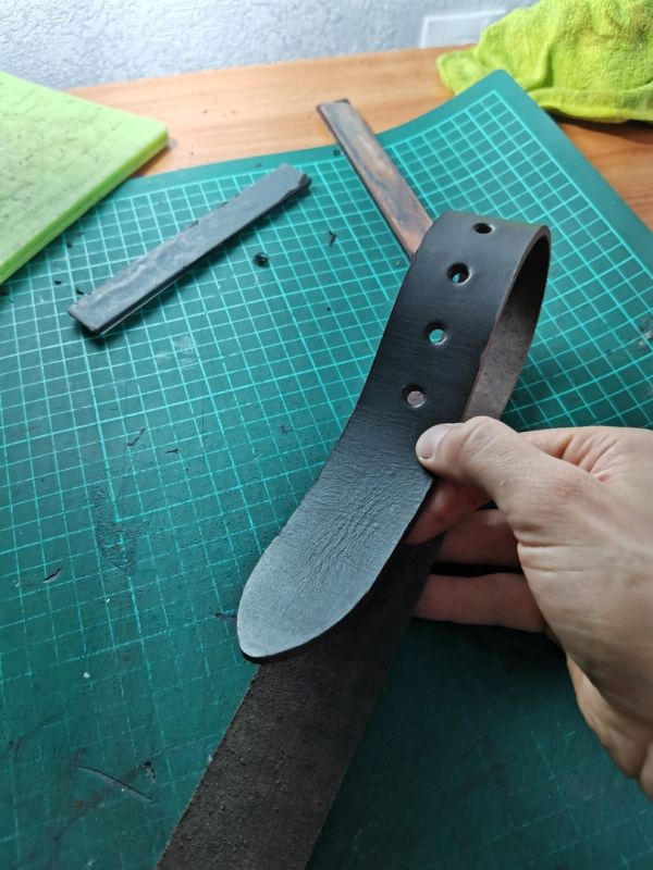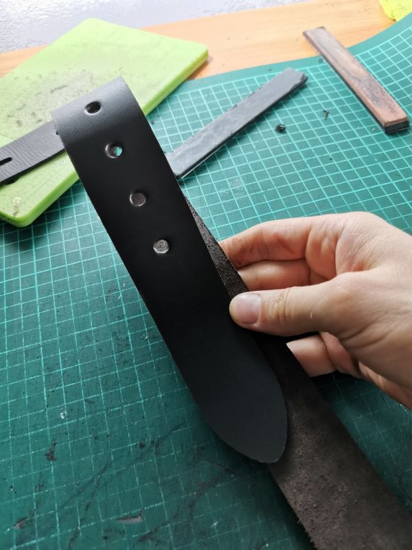 Далее размечаю и пробиваю отверстия и обрезаю кончик ремня
