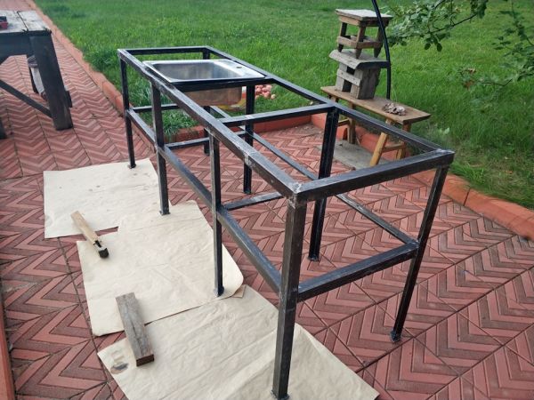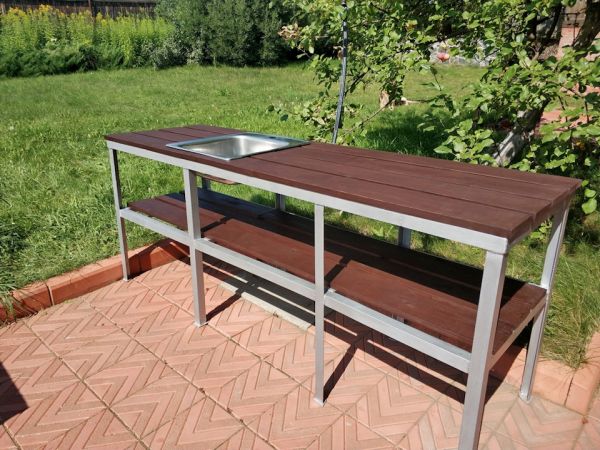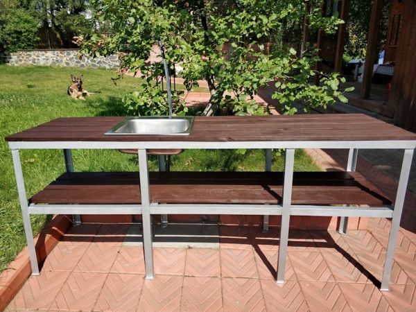 Врезал в стол нержавеющую мойку, вода к столу была проведена ранее, слив тоже есть, так как ранее там стоял деревянный стол, который со временем обветшал.