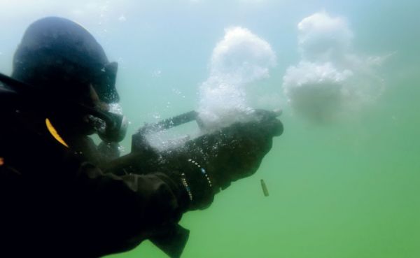 Армейские водолазы не просто так используют для ведения огня под водой специальное оружие со специальными патронами. Поэтому можно с уверенностью сказать, что большинство фильмов, демонстрирующих, как герои спасаются от выстрелов в воде, не так уж далеки от истины (хотя некоторая степень художественного преувеличения все-таки есть). Оказавшись в воде, пуля сталкивается с куда большим сопротивлением, чем при движении в воздухе. Все потому, что плотность Н2О почти 800 раз выше, чем плотность воздуха. В результате, большинство винтовочных боеприпасов будет двигаться в воде примерно 1-1.5 метра со скоростью и силой, достаточной для поражения человека.