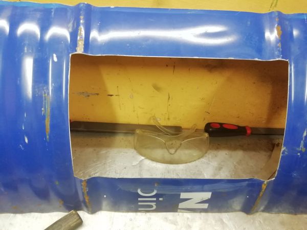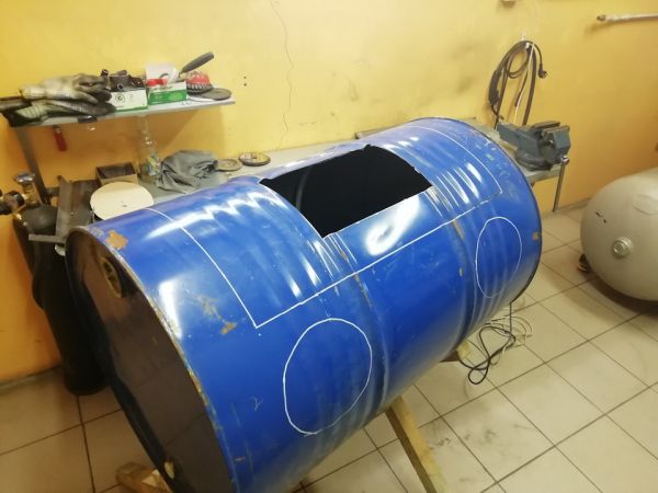 Ну так вот, будучи на металлоприемке и рассматривая листовой металл, подумал, что треугольно-параллепипедную конструкцию будет накладно из него болгаркой вырезать, без гильотины-то. Поэтому обратил свое внимание на бочку 220 л. из под какого-то полимера. А что? Намана, подумалось, и забрал ее рублей за 500 р.