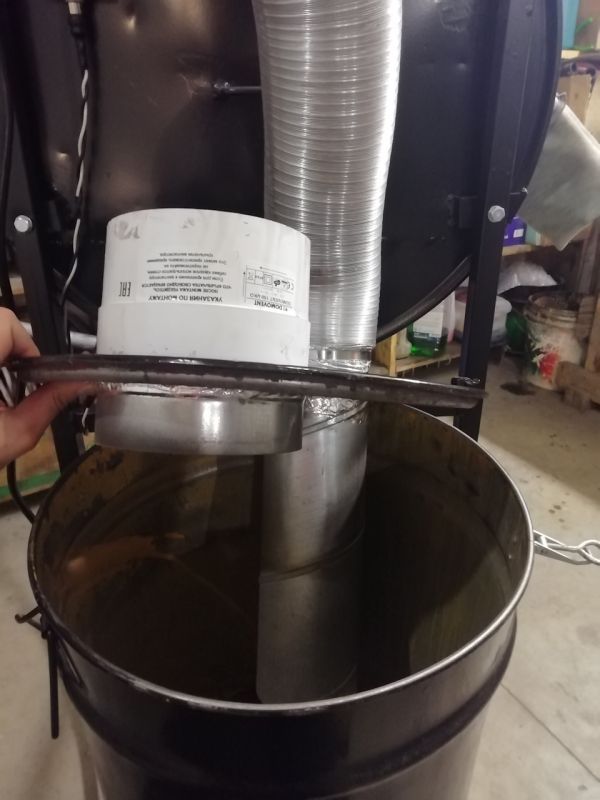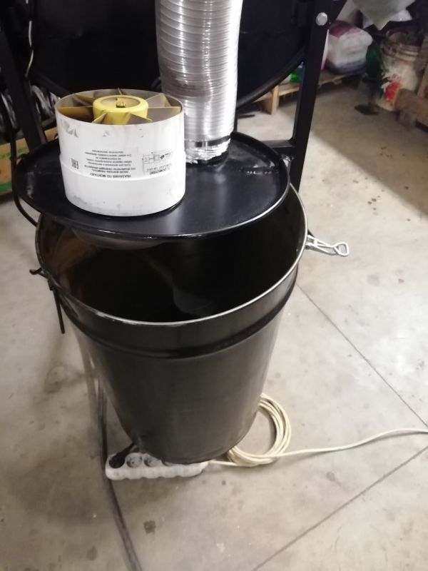 Позже нашел также на свалке бочку литров 20 из-под краски, определил ее под простейший сепаратор с канальным вытяжным вентилятором 150 мм. Так как песочу стеклошариками, то пыли не особо много. Если речником работать, то думаю нужно отдельно подключать хороший по КПД вытяжной вентилятор.