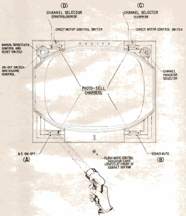 Каждый фотоэлемент в телевизоре отвечал за отдельную функцию. Направляя поток света, исходящий из пульта, на разные углы, пользователь переключал каналы по/против часовой стрелки, регулировал громкость или включал/выключал телевизор.