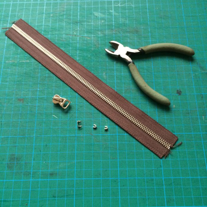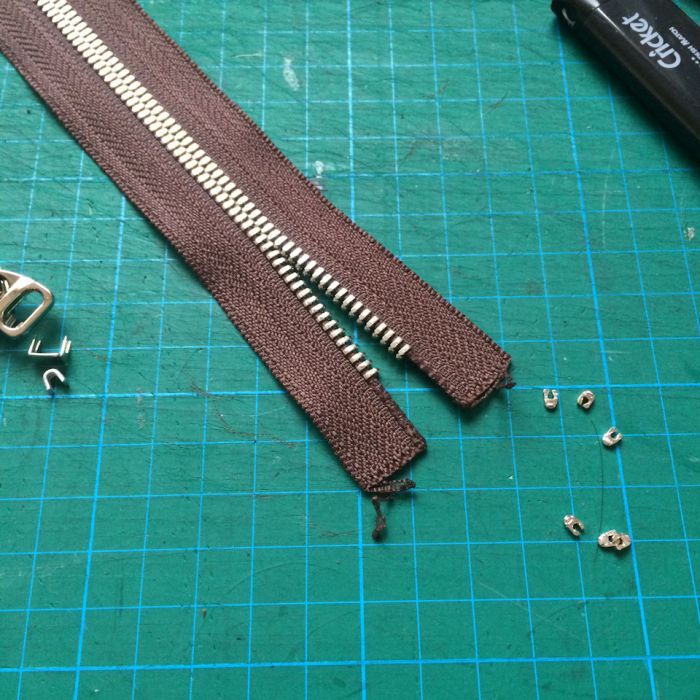 Настала очередь для молнии, убираем зубцы, вставляем бегунок и крепим ограничители …