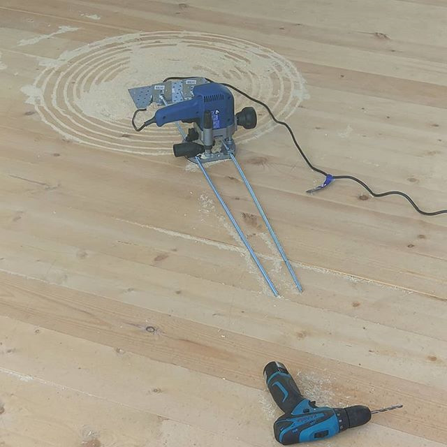 А беда была в том что фрезер купил, пилить им начал только через месяц, и 14 дней возврата я прои…пустил, сдал по гарантии в ремонт, прождал весь срок день в день, и все это из-за сколовшейся щётки. Я был в шоке, что их так долго меняют. Ну там ещё фреза в итоге прикипела к "патрону", но это уже мелочи. Вот перфоратор, и миксер норм у них, а фрезер что-то как-то подвел, но да ладно, пусть у них писька за это не стоит.На предыдущем фото видна "приспособа, циркуль для фрезера, обычная пластина и строй магаза, по центру спиленый на конце, в конус болт, пара уголков в которые влезет 8я (вроде, подбирал под отверстия на подошве фрезера) шпилька, прижал 2мя гаками эти шпильки, а свободные концы в подошву фрезера, в соответствующие отверстия. Конструкция довольно шаткая, но для подобных, неточных работ вполне годиться, нужно поточнее ищите направляющие у станкостроителей, есть такие трубки НЕполые, но и НЕдешевые они.