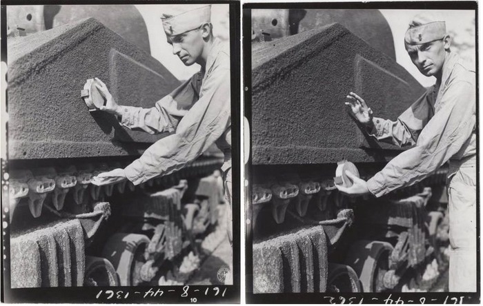Архивные фото американского солдата с магнитной миной в руках.Командование Третьего рейха в срочном порядке стало искать способы решения обнаруженной ими проблемы. И нашли: в 1943 году предприятие «Химический Завод Циммера и Ко» наладил производство специального циммеритового покрытия, которое должно было снизить магнитные свойства брони танка и попросту не давать кумулятивным минам зацепиться за нее.