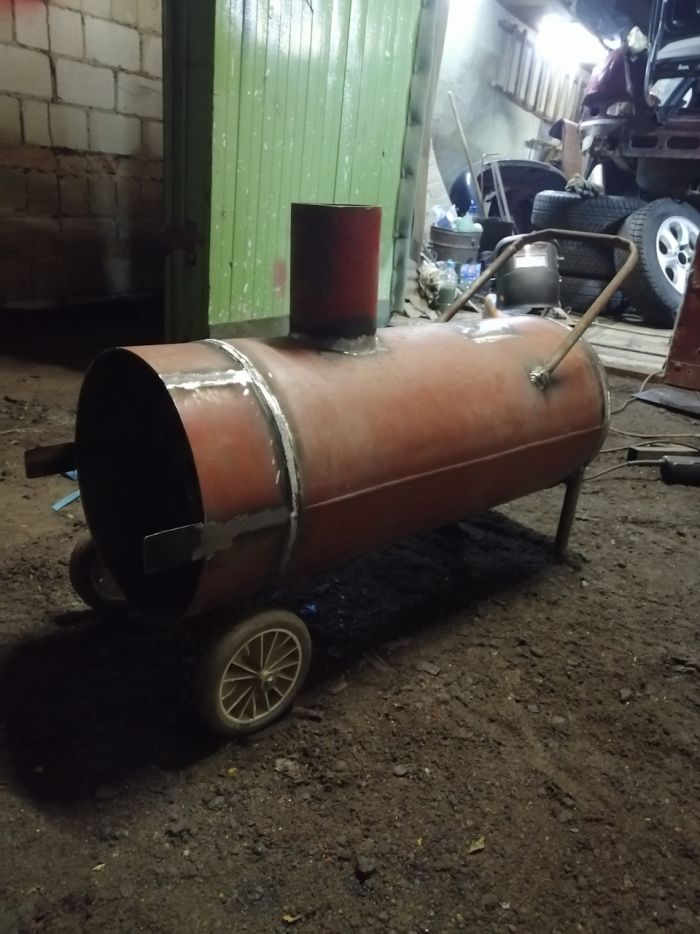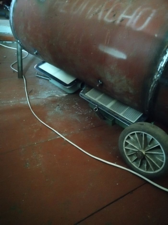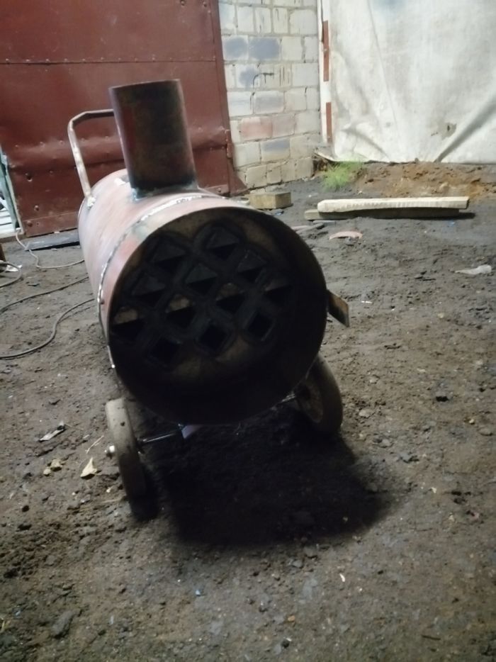 В прошлом году изготовил себе тепловую газовую пушку. Эффективностью остался доволен. Гараж 4×6 прогревает с — 5°С до +17°С за полчаса. 40л пропана хватает на 100 часов работы пушки. В этом году я сварил такую же пушку во второй гараж. Вторую пушку перевел на метан, так как этот газ дешевле, безопаснее, да и все мои машины работают на метане. В качестве нагревательных элементов использовал 2 инфракрасных газовых обогревателя ГИИ-3,6 "солярогаз". Внутри баллона вварил 12 труб 40×40.Нижний ряд труб вварил толщиной стенки 3мм, а остальные 2мм.