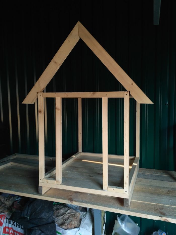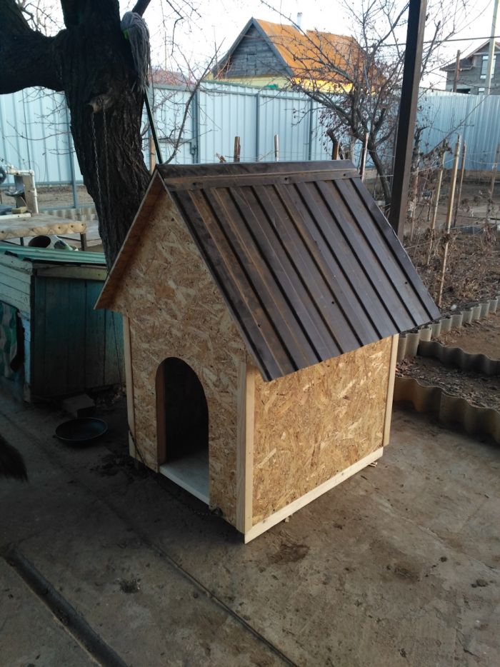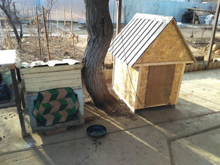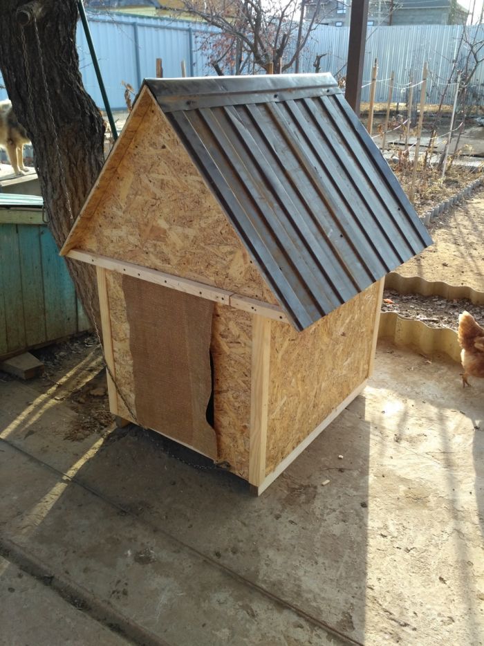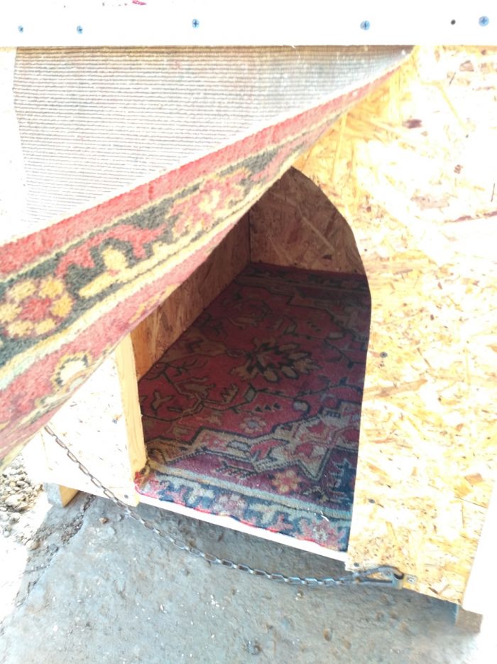 Будка получилась теплая, внутрь был установлен эстругированный пенополистерол 30 мм тоже был. На пол был вырезан из старого паласа коврик и из него же что-то вроде ветрозащиты)))) уж очень пес привык к импровизированной двери.