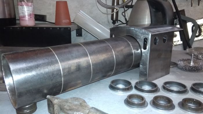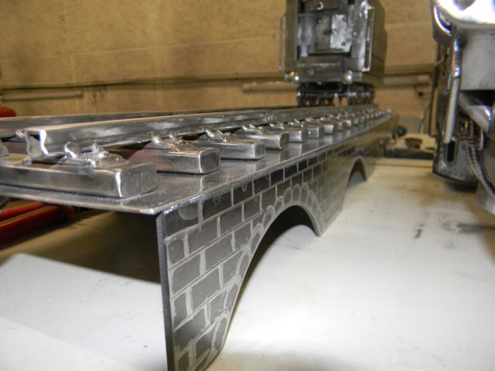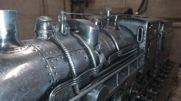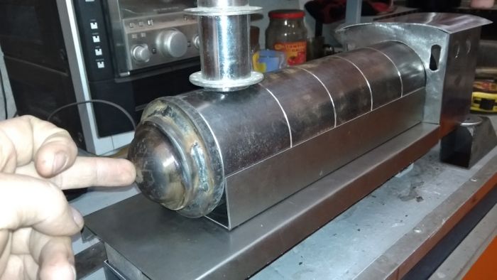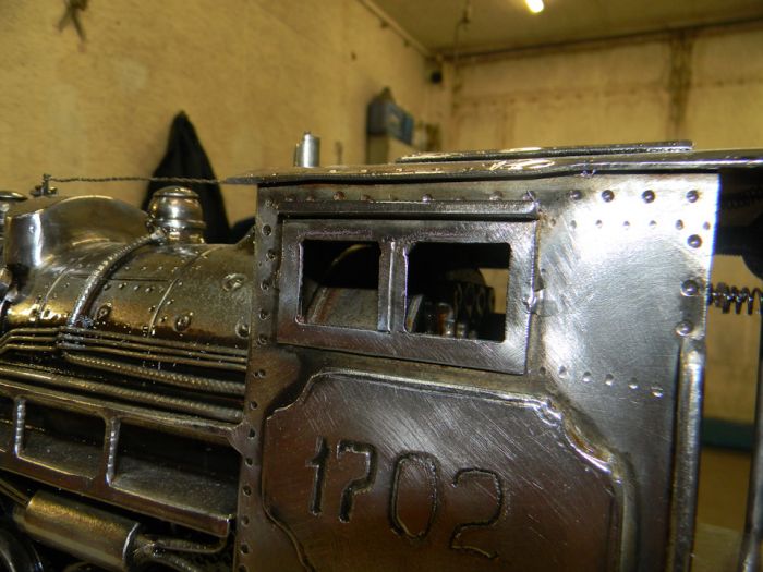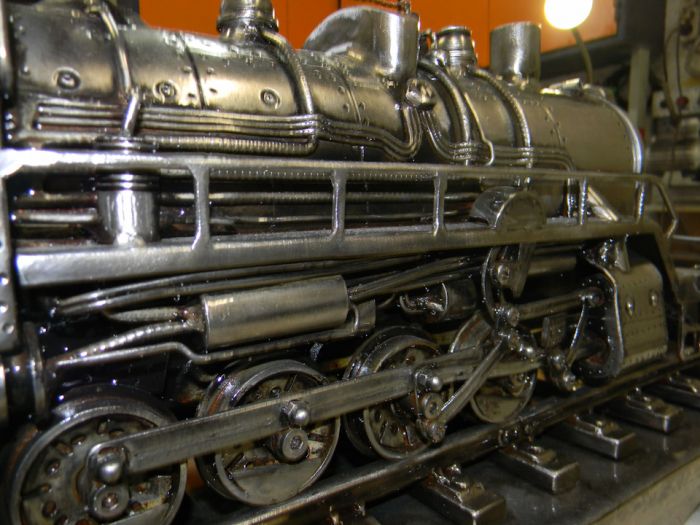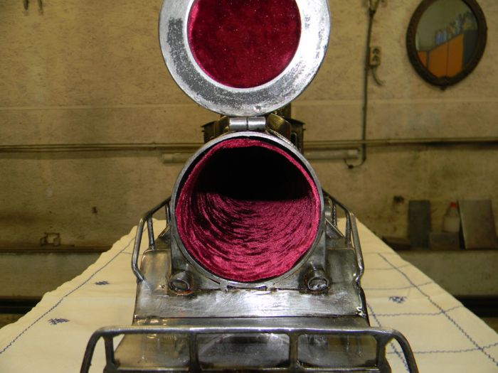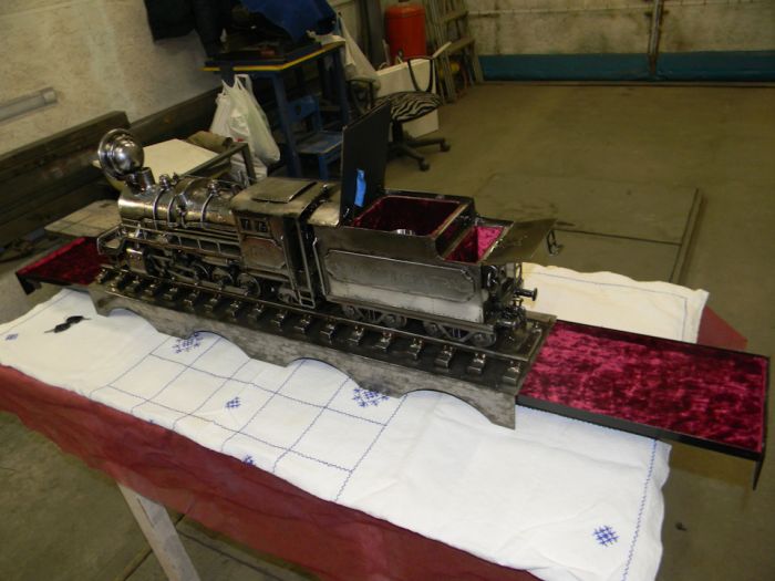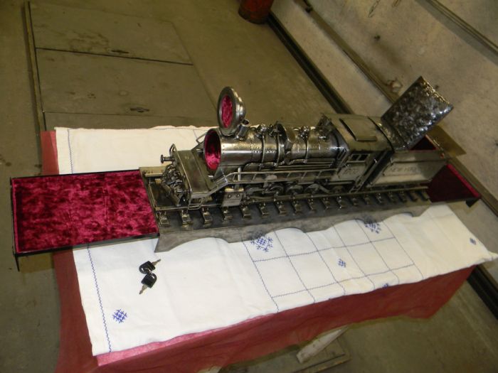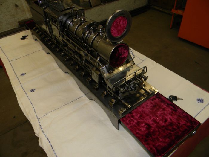 Доброго времени читающему! Читаю давно этот блог. Не помню писал ли я сюда хоть раз или нет, но всё таки рискну! Ну вот и подошел к концу очередной мини-проект с одноименным названием «Бар под алкоголь в виде паровоза». Идея зародилась в голове после просмотра здесь же в этом сообществе, — человек выкладывал свой вариант паровоза. Захотелось сделать что то этакое, чего нету ни у кого( хотя могу и ошибаться).Делал неделю…(шутка) делал 3 месяца.Хотелось еще оснастить его механизмом подачи дыма (пара), но для данной поделки не стал замарачиваться с дымогенератором, да и хотелось уже завершить быстрее. Но, тем не менее, изделие не лишено интересных мелочей, таких как, детализация органов управления, топка, сидения в будке машиниста, детализация тендера со створками, дверцами, лотком, навесным ящиком, встроенным шкафом, а также откидной мостик между паровозом и тендером. Добавить к этому можно еще, наличие сигнального колокола, двигающегося от кнопки на крыше будки. Колокольчик конечно звуков не издает, так как габаритные размеры не позволяют внедрить подвес (ибо я не ювелир). Достаточно сложно было изготовить механизм экипажной части паровоза, которая отняла много времени и сил, а так же тележка тендера, в которые успешно были вставлены пружинки. Детализация так же затронула механизмы сцепки. В роли гидроприводов выступают спицы от велосипедного колеса, в роли всевозможных трубок, шлангов и прочей арматуры включая поручни, лестницы и т.д. использовалось обычная стальная проволока разного сечения от 2 до 6 мм. Рельсы изготовлены из профильной трубы квадратного сечения 10х10. Для изготовления шпал использовалась проф. Труба 10х20. Для колес экипажа использовалась труба 51 мм. Мост изготовлен из металла 3 мм. Ну и конечно, самое главная деталь в этом баре, была изготовлена из трубы 89 мм., ее внутренняя глубина 34 см.- что позволяет поместить туда, водочную или винную бутылку объемом 0,7 литра.(больше не проверял). Далее, на тендере произведена имитация угля (она же является крышкой отсека для рюмок. четыре больших рюмки.), а так же закрывающейся крышкой портсигар. В процессе изготовления так как делалось всё не спеша, то решил добавить ящики спереди и сзади моста. В ящики врезал замки.Также для удобства открытия- закрытия вставил толкатели мебельные. Лицевые стенки моста, имитированы под камень. Что касается цвета изделия, то хотелось сначала всю конструкцию покрыть медью, но эксперимент прошел неудачно и при меднении, медь ложилась не равномерно и получалась полу облезлая конструкция и выглядела безобразно. В итоге, огорчившись, пришлось все счищать, причем счищать механическим способом. На устранение данной ошибки ушло, около двух недель. Ну а далее, решено было покрасить краской и вскрыть лаком.Краска на подбор (основа)+ биндер, лак novol hs.