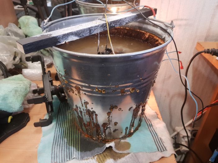 Подключение к ведру + от БП, к металлу очищаемому — минус БП,После более суток очистки смыл все водой под краном и зубной щеткой, все слезло отлично