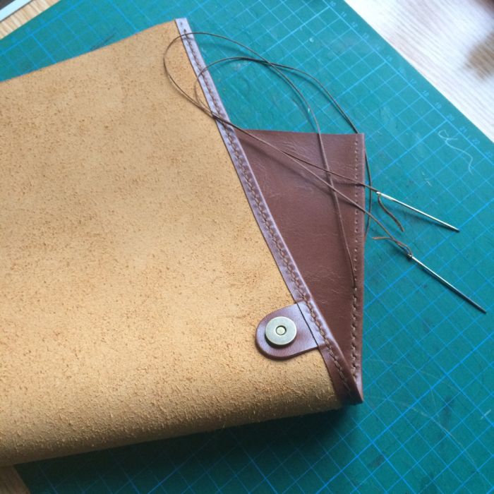 Делаем пробойником строчку шагом 5 мм и прошиваем вручную вощеной нитью.
