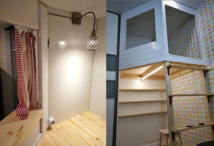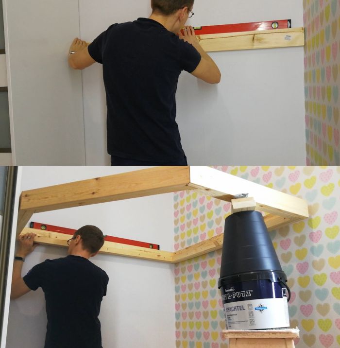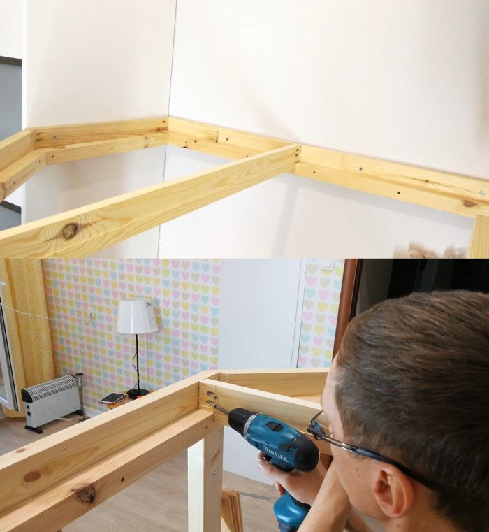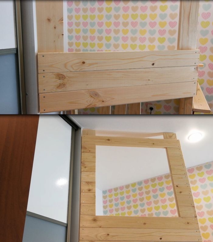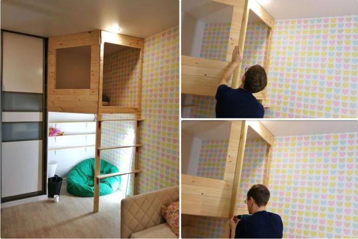 В комнате был угол между шкафом и стеной. В нем складировались игрушки и больше он никак не использовался. Я прикинул, что там можно смастерить домик чердак. Высота потолков 2.7м. Высота лестницы получилась 1,45м. В самом домике 1,25м.