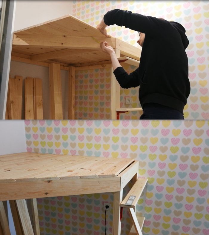 Укладываю весь пол. Отмечаю лишнее и обрезаю. На выходе получилась вот такая конструкция. Второй ярус в комнате готов.