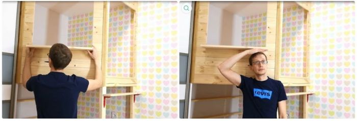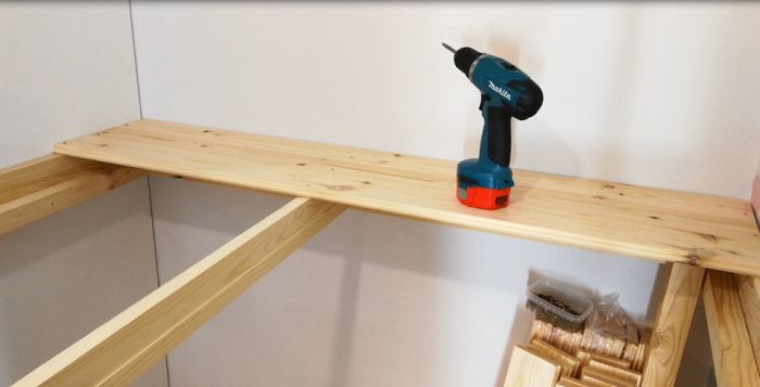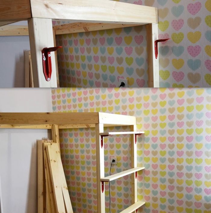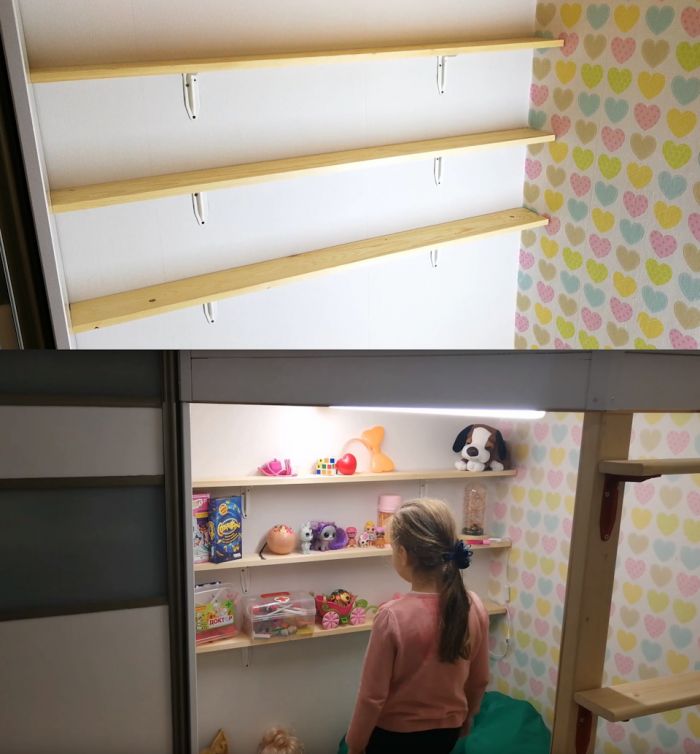 Под домиком я сделал 3 полки для хранения игрушек. Использовал доску 90*20*1500мм и уголки. Уголки такие же как и для ступеней, но я покрасил их в белый цвет.