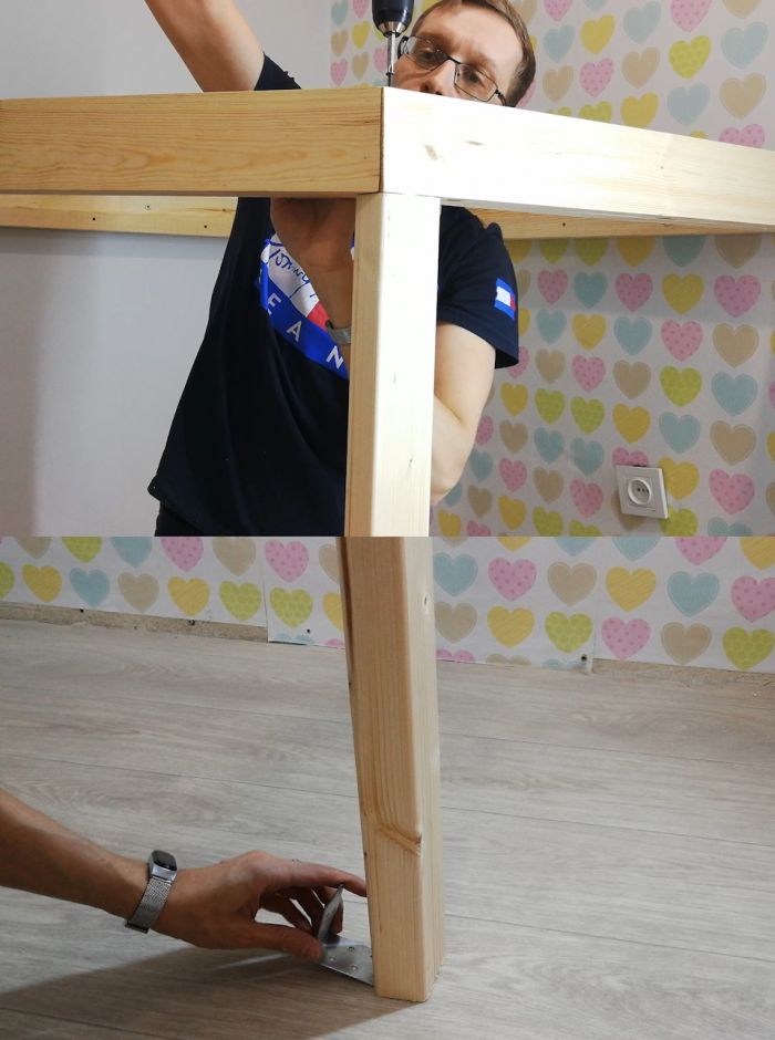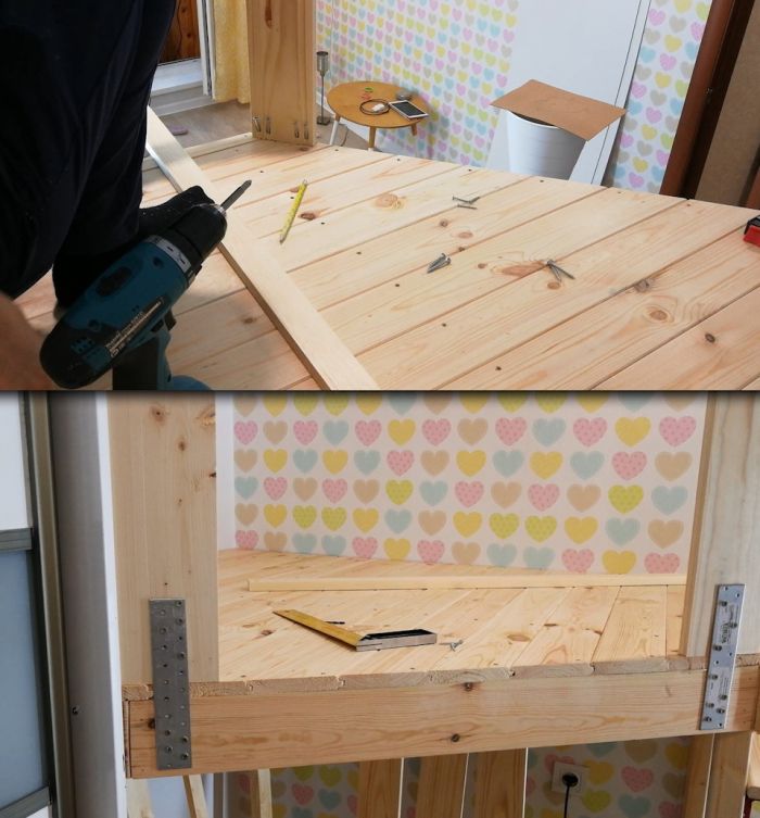 Зафиксировав каркас, я приступил к изготовлению лестницы. Для этого я взял 2 бруса 45*70*1500 мм. Сверху я зафиксировал с помощью саморезов, а внизу на металлические уголки.