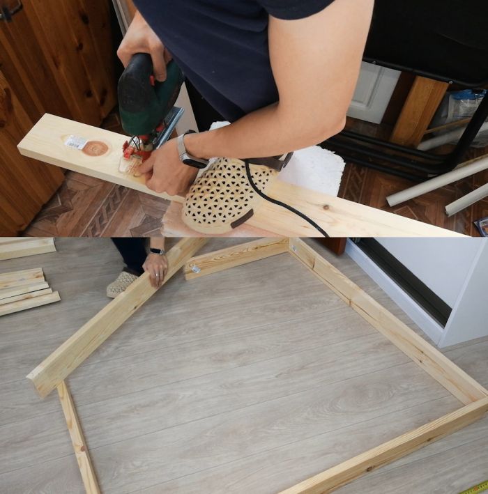 Приступаю к изготовлению каркаса для домика. Я использовал сосновый брус 30*70*1500 мм. Отмеряю нужную длину и отпиливаю брус.