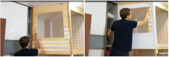 Для окошка нужен подоконник. Купил мебельный щит 1000*200*18 и обрезал под нужный размер. Высоту подоконника подобрал такую, что бы я смог спокойно под ним ходить и не ударяться головой.