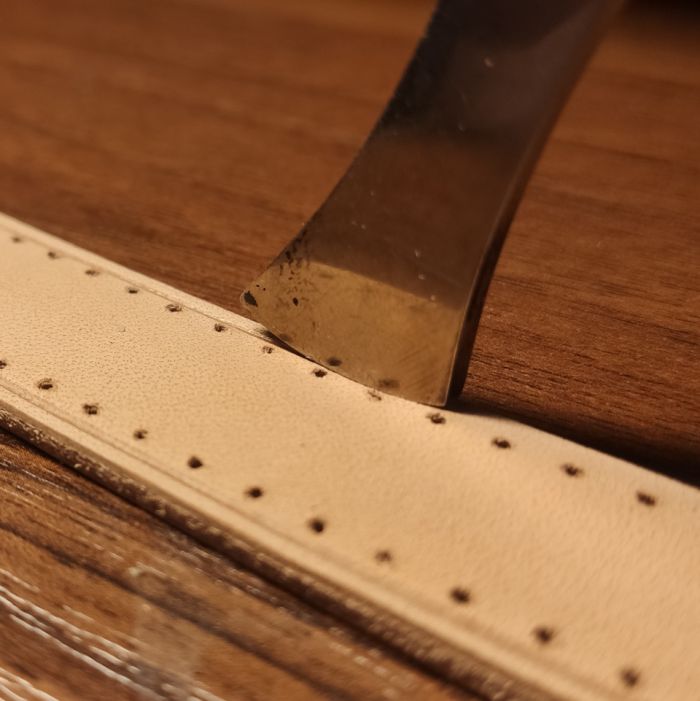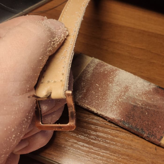 Получилось вполне хорошо, потом сделаю нормальный свет и будет вообще здорово.Теперь надо подготовить ремешки. Из-за того, что кожа оказалась слишком тонкой, пришлось оба ремешка делать из двух слоёв, склеенных между собой. Так получилось гораздо приятнее на взгляд и ощупь, хотя, в принципе, и не очень требовалось. Далее ремешки шлифуются для пущей ровности края и с целью снять фаску по всей длине, иначе при окончательной обработке края кожи превратятся в уродливую "юбочку".