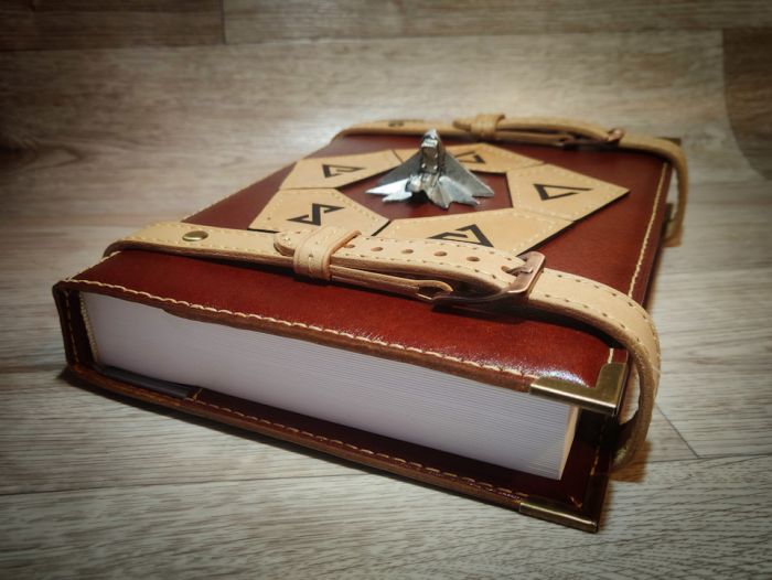 Результат меня порадовал. Книга получилась толстой и солидной, настоящий фолиант! Кожа была итальянская и аргентинская, обе растительного дубления и высокого сорта, с такой работать одно удовольствие. Вообще вся работа мне принесла только положительные эмоции, ведь делалась фанатом для фанатов!