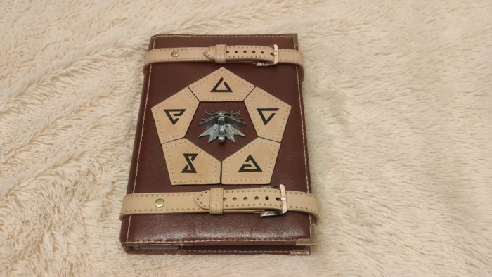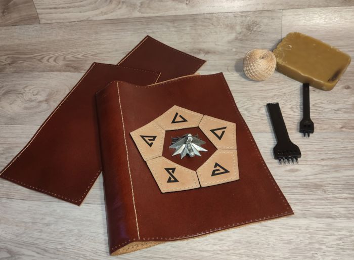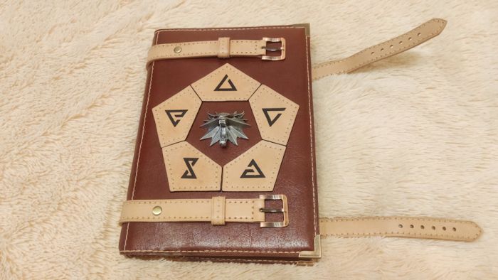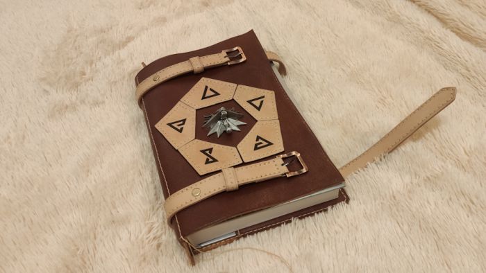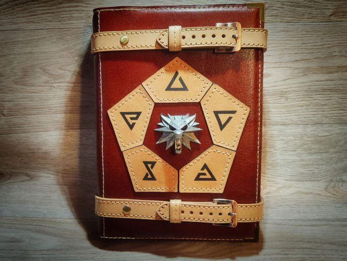 Для начала нужно было определиться с дизайном. В наличии был медальончик, давно уже купленный на Али. На него и решил опираться. Расположение ему, естественно, на самом видном месте — в центре! Скромно признаюсь, что я и сам поклонник третьей игры про ведьмака и книг Сапковского, поэтому его мир мне близок и любим. А что в игре одно из основных действий, без которого, зачастую, невозможно выполнить задание (особенно, если играешь на повышенной сложности)? Наложение заклинаний! Значит, и знаки этих самых заклинаний тоже должны быть во главе композиции! Ну и для придания аутентичности, ремешки, запирающие книгу, решил разместить сверху и снизу.