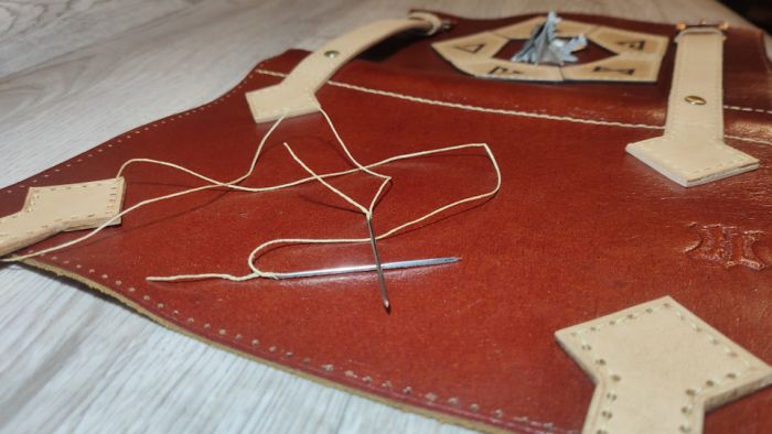 Далее прошиваю заднюю часть обложки, поскольку основной шов по периметру будет фиксировать ещё и ремешки, а со вставленной книгой шить такое будет крайне неудобно. После помещаю книгу на законное место.