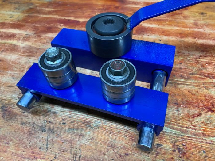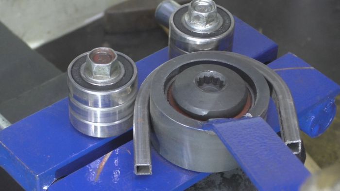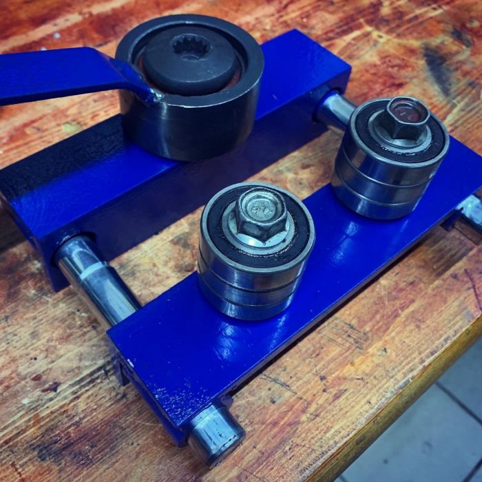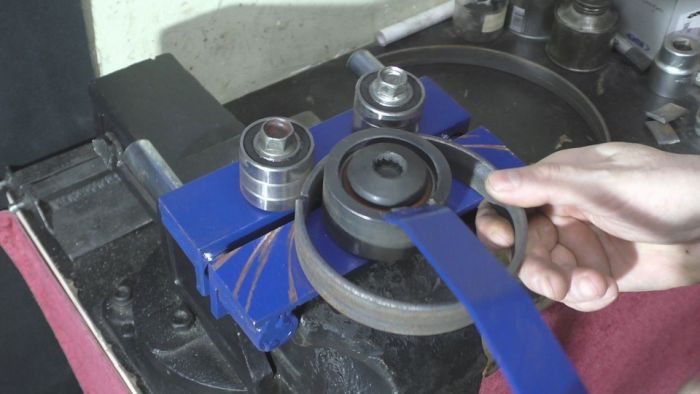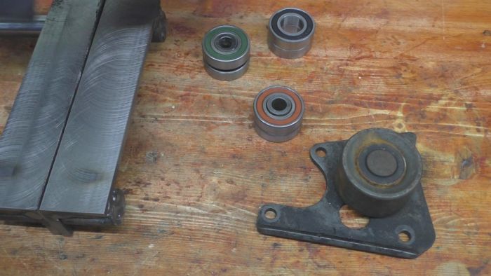 Всем привет друзья, ещё одна полезная самоделка из старых автозапчастей. Адаптер для тисков, для изготовления колец из шинки прутка и профельной трубы. За основу был взят уголок 80*80 с толщиной полки 8мм. Который в последствии был немного обработан и стал 50*50 и 200мм. Также была использована старая стойка от автомобиля, вернее её шток. В качестве роликов были использованы подшипники добытые из роликов системы ГРМ. Крепление осуществил болтами м12 и м14, болты автомобильные с хорошим класом прочности.