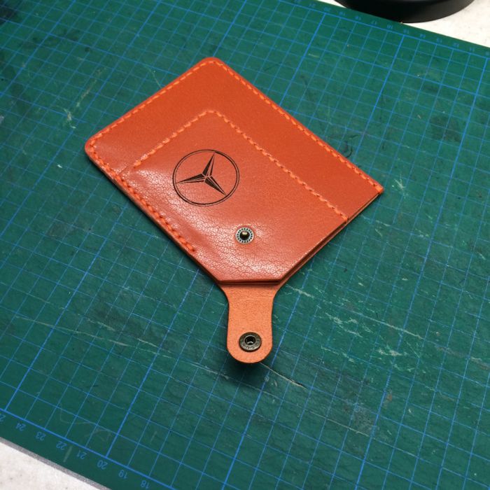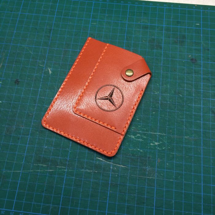 Прошиваем вручную вощеной нитью и срезаем угол … На задней части холдера делаем такой хлястик/застежку …