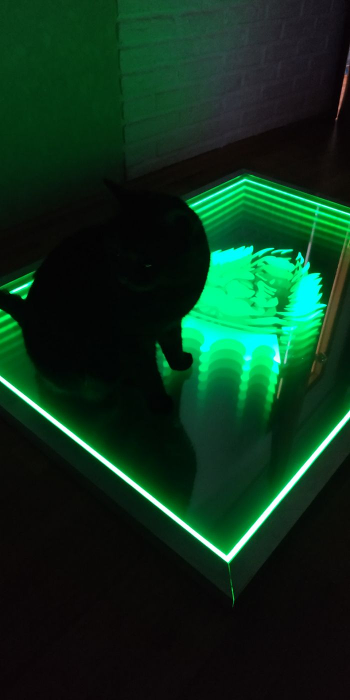 Всем Здравствуйте, вот и закончилась эпопея с моей сборкой зеркала с эффектом бесконечности, все заказывал на АлиЭкспресс это лента светодиодная и WiFi контроллер, обрезки пластика брал на производстве рекламы, про эффект бесконечности думаю можно не писать так как в интернете есть куча роликов про это, получилось достаточно компактно но и вес вышел приличный но это не проблема, результатом доволен.