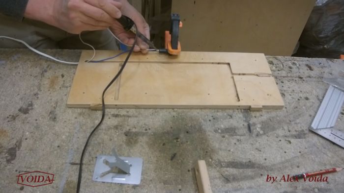 В торцах пластины я сделал отверстия, так, чтобы они соединялись с пазами. Через эти отверстия я выпустил проводку. Здесь цепь замкнется через нихромовую струну на участке между направляющими. Благодаря этому участки струны, проходящие через направляющие и соприкасающиеся с крепежом, не будут нагреваться.