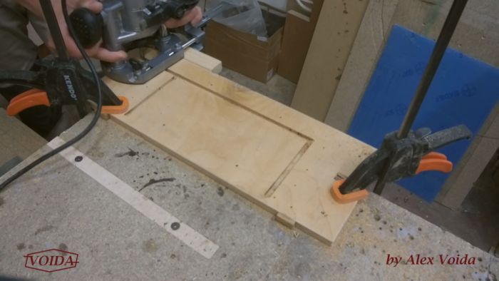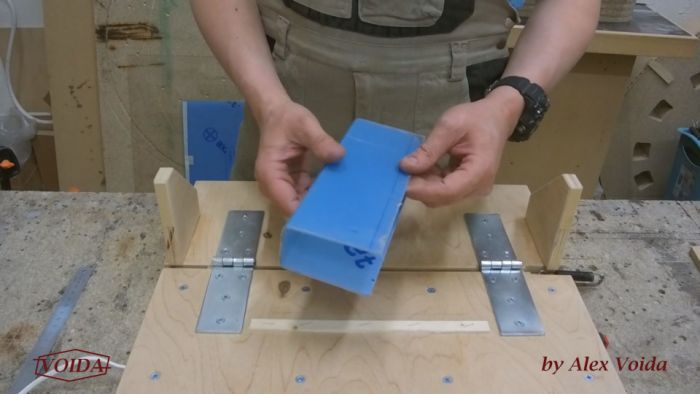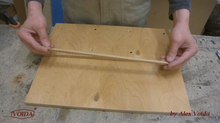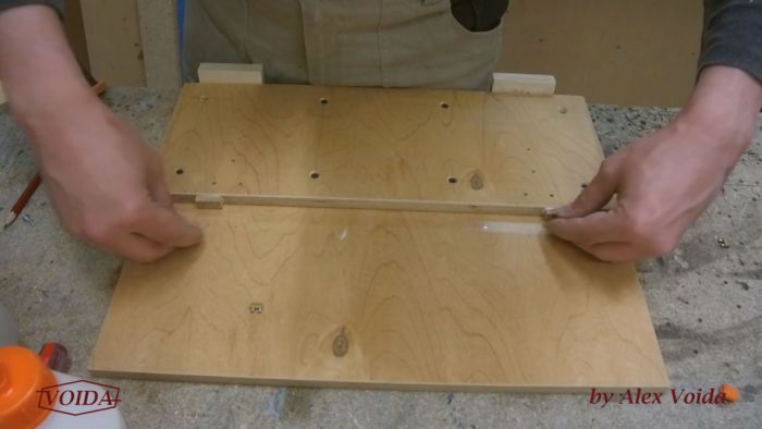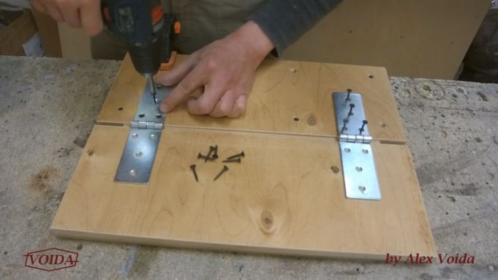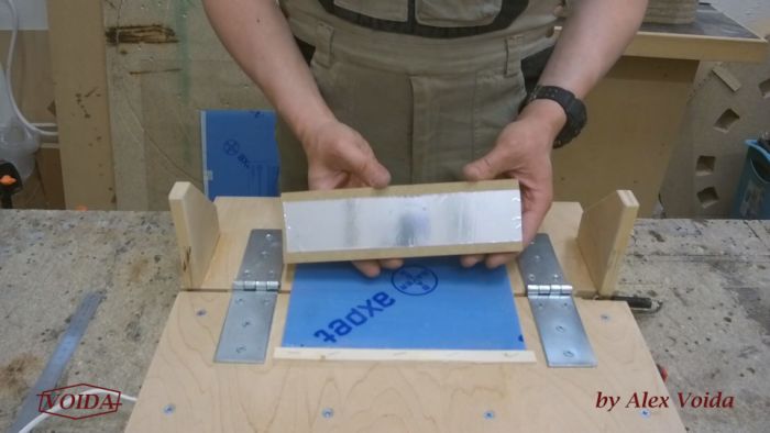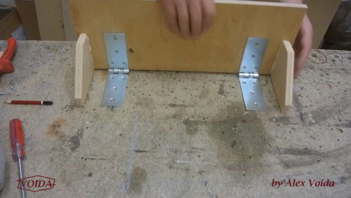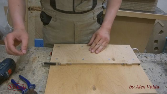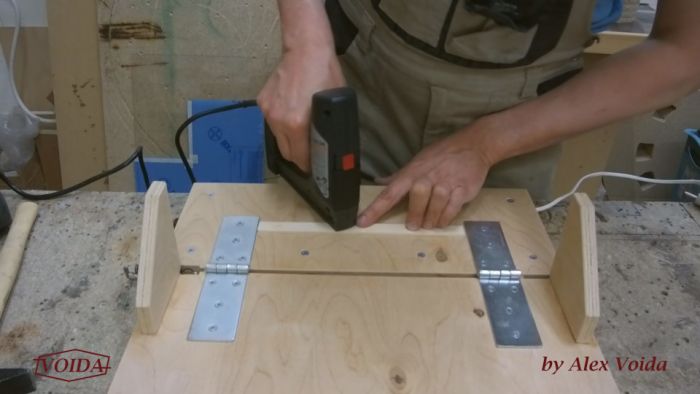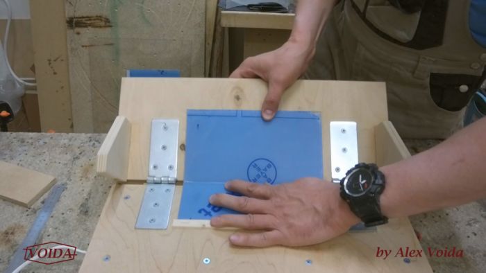 Небольшие кусочки фанеры, по краям подвижной части, ограничивают ее поворот ровно в положении 90 градусов. Форма этих деталей определяет угол изгиба оргстекла. Упоры могут быть сменными, но эта светлая мысль пришла мне в голову уже после того, как высох клей.