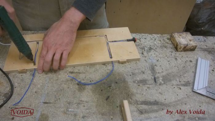 Они приклеены к торцу неподвижной пластины. Помните о безопасности! При работе нагревающая струна раскаляется докрасна. Не допускайте длительного нагрева струны, деревянная конструкция может воспламениться. И не трогайте струну – это может вызвать ожоги и электротравмы.