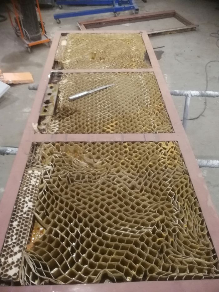 Внутри обнаружил такое картонное безобразие. Перемычки в жести оставил на всякий случай, чтобы дверь не потеряла форму. Понял, что это не обязательно