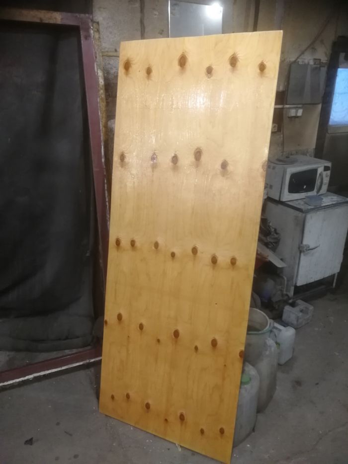 Осталось прикрутить сверху фанеру и поставить дверь на место. Кстати, я перевернул дверь вверх ногами вместе с проемом, так как она открывалась в другую сторону. В моем случае, достаточно было снять петли и переставить под ними упорные шайбы сверху вниз. Фоток нет, но если кто будет заморачиваться-поймет по ходу дела.©