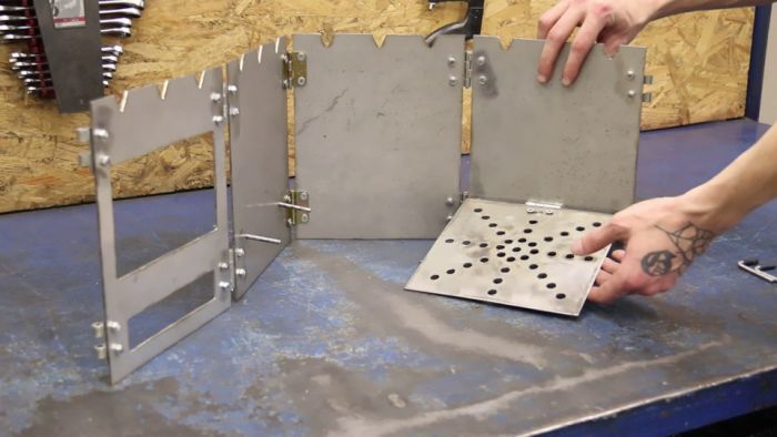 Собрал на петлях.К одной из стенок прикрепил пластину с отверстиями так же на петле.